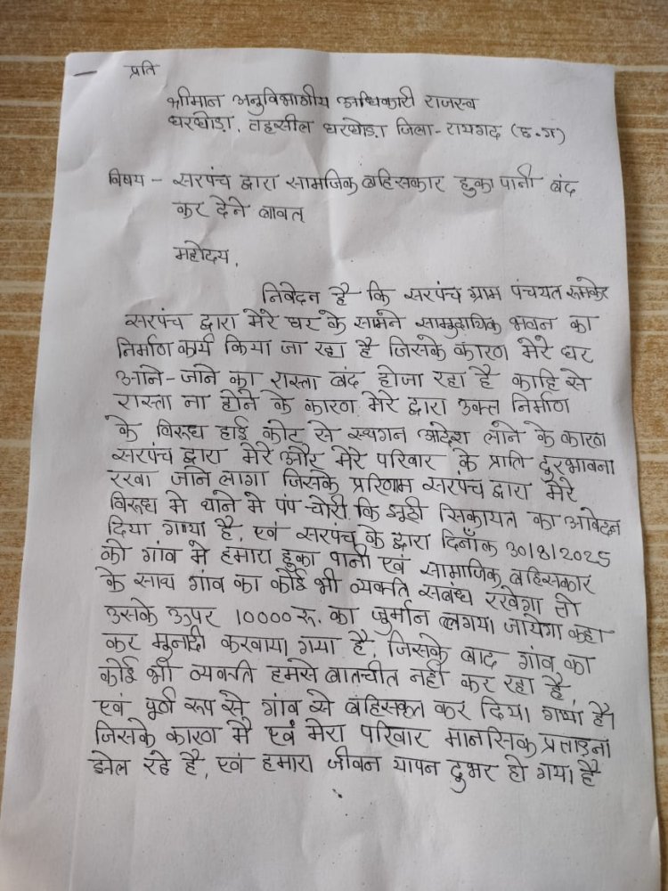 सामाजिक बहिष्कार का दंश झेल रहे पीड़ित परिवार द्वारा एसडीएम को दिए गए ज्ञापन में उल्लेख किया गया है कि सरपंच ग्राम पंचयत रूमकेरा सरपंच द्वारा मेरे घर के सामने सामुदायिक भवन का निर्माण कार्य किया जा रहा है जिसके कारण मेरे घर आने-जाने का रास्ता बंद हो जा रहा है कहि से रास्ता ना होने के कारण मेरे द्वारा उक्त निर्माण के विरुद्ध हाई कोट से स्थगन आदेश लाने के कारण सरपंच द्वारा मेरे और मेरे परिवार के प्राति दूरभावना रखा जाने लागा जिसके परिणाम सरपंच द्वारा मेरे विरूध में थाने में पंप चोरी कि झूठी सिकायत का आवेदन दिया गाया है, एवं सरपंच के द्वारा दिनांक 30/8/2025 को गांव में हमारा हुका पानी एवं सामाजिक बहिसकार के साथ गांव का कोई भी व्यक्ति सबंध रखेगा फोर उसके ऊपर 10000 रु. का जुर्मान लगाया जायेगा कहा कर मुनादी करवाया गया है, जिसके बाद गांव का कोई भी आदमी हमसे बातचीत नहीं कर रहा है, एवं पूर्ण रूप से गांव से बंहिसकृत कर दिया गया है। जिसके कारण में एवं मेरा परिवार मानसिक प्रताड़ना झेल रहे है, एवं हमारा जीवन यापन दूभर हो गया है। अतः महोदय से निवेदन है कि सबंध में उचित कार्यवाही करे जिससे में एवं मेरा परिवार सम्मान पूर्वक जीवन यापन कर सक।