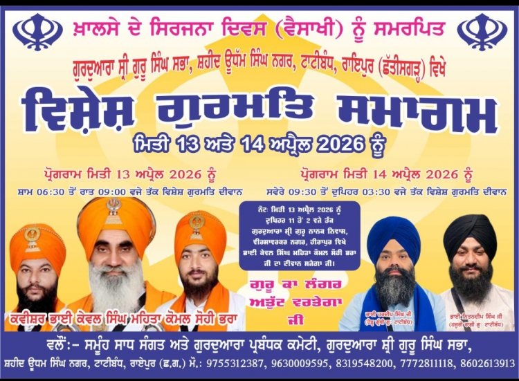 खालसा पंथ स्थापना दिवस (बैसाखी पर्व) के पावन अवसर पर दिनांक 13 एवं 14 अप्रैल 2026 को विशेष धार्मिक दीवानों का भव्य आयोजन किया जा रहा है। मुख्य आयोजन गुरुद्वारा श्री गुरु सिंह सभा गुरु नानक नगर में आयोजित है |