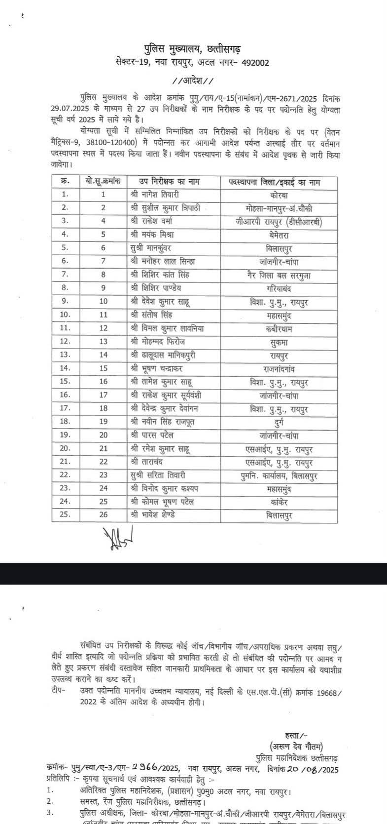 रायपुर। छत्तीसगढ़ पुलिसकर्मियों के लिए इस वक्त एक बड़ी खबर सामने आ रही है। जहां राज्य सरकार ने पुलिस विभाग के 27 उप निरीक्षकों का निरीक्षक पद पर प्रमोशन किया है। सुप्रीम कोर्ट के आदेश के अनुपालन में डीजीपी अशोक देव गौतम ने यह सूची जारी की है। यहां देखें पूरी लिस्ट