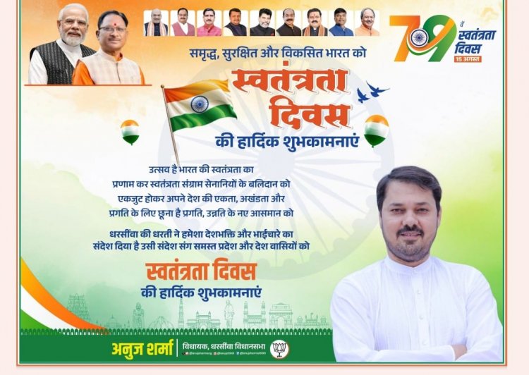 विधायक अनुज शर्मा ने समस्त छत्तीसगढ़ वासियों को स्वतंत्रता दिवस की बधाई व शुभकामनाएं देते हुए कहा कि यह दिन हम सभी भारतीयों के लिए बहुत ही गौरव और हर्ष का दिन है। इस गौरवशाली दिवस पर हमारे देश को स्वतंत्रता दिलाने वाले सभी अमर शहीदों, स्वतंत्रता सेनानियों और वीर सपूतों को मैं कोटि-कोटि नमन करता हूँ, प्रणाम करता हूँ जो खुद को तिल-तिल जलाकर देश में आजादी का सूर्योदय किया व देश की रक्षा के लिए अपना सर्वस्व अर्पण करने वाले वीर जवानों को नमन करता हूं। साथ ही, देश की एकता, अखंडता और स्वाभिमान के लिए दिन-रात एक करने वाले वीर जवानों का भी वंदन करता हूँ।आइए, हम सब मिलकर स्वतंत्रता संग्राम के अमर बलिदानियों के सपनों को चरितार्थ करें और विकसित, आत्मनिर्भर व हर क्षेत्र में श्रेष्ठ भारत के निर्माण में अपना सर्वोच्च योगदान देने का संकल्प लें। हम सभी ने विगत कुछ दिनों से आजादी के जश्न को तिरंगा यात्रा के रूप में मनाया, तिरंगा यात्रा को लेकर जन-जन में जो अद्भुत उत्साह और उमंग है, वह राष्ट्र के प्रति प्रेम,सम्मान व देश भक्ति को दर्शाता है। इस यात्रा के माध्यम से घर-घर में तिरंगा लहरा कर हम सभी देशवासियों को अपने स्वतंत्रता सेनानियों के प्रति श्रद्धा भाव को सदैव बनाये रखने का संकल्प लेना है। मेरी कामना है कि यह सुअवसर सभी क्षेत्रवासियों के जीवन में नया जोश और नई स्फूर्ति लेकर आए, जिससे विकसित भारत के निर्माण को नई गति मिले।हमें अपने स्वतंत्रता संग्राम सेनानियों के बलिदान को स्मरण करते हुए एकजुट होकर ‘विकसित छत्तीसगढ़’ और ‘विकसित भारत’ के लक्ष्य को प्राप्त करने का संकल्प लेने की प्रेरणा देता है। आजादी का यह अमृतकाल, नये भारत के निर्माण के हमारे संकल्प को सिद्धि तक पहुंचाने की यात्रा है। हम सभी को संकल्पित होकर सद्भाव के साथ भारत का नव-निर्माण करने के सपनों को पूरा करने में हमारे प्रधानमंत्री श्री नरेंद्र मोदी जी का साथ दे| जय हिन्द ????????