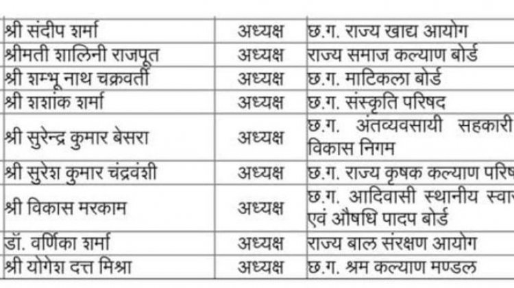 छत्तीसगढ़ के निगम, मंडल और आयोग में दायित्व संभाल रहे हमारे अध्यक्ष/उपाध्यक्ष को आज राज्य शासन द्वारा कैबिनेट मंत्री/राज्य मंत्री का दर्जा प्रदान किया गया है। मुझे पूर्ण विश्वास है कि आप सभी जनसेवा, सुशासन और विकास के हमारे संकल्प को और गति देंगे तथा प्रधानमंत्री नरेंद्र मोदी के विकसित भारत के संकल्प को साकार करने में अग्रणी भूमिका निभाएंगे। छत्तीसगढ़ की प्रगति यात्रा में इस नई भूमिका के लिए आप सबको हार्दिक शुभकामनाएं।