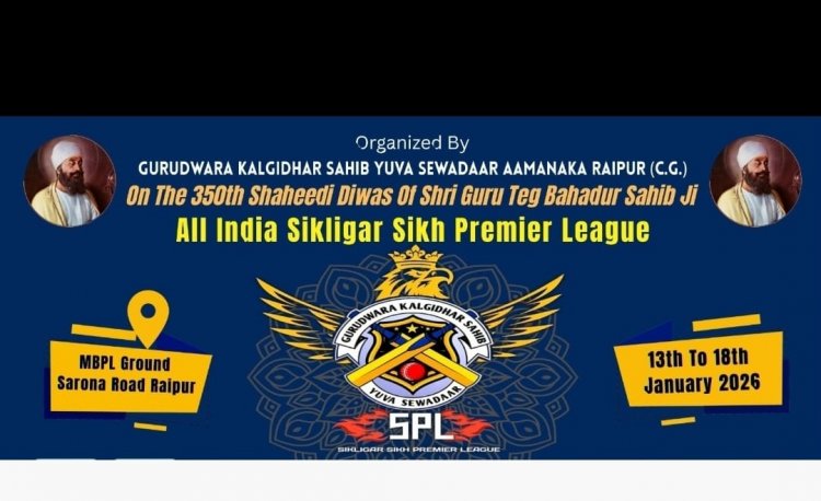 रायपुर में ऑल इंडिया सिकलिगर सिख प्रीमियर लीग SPL का भव्य आयोजन किया जा रहा है। यह प्रतिष्ठित क्रिकेट प्रतियोगिता शहीदों के सरताज श्री गुरु तेग बहादुर साहिब जी के 350वें शहीदी दिवस को समर्पित है।