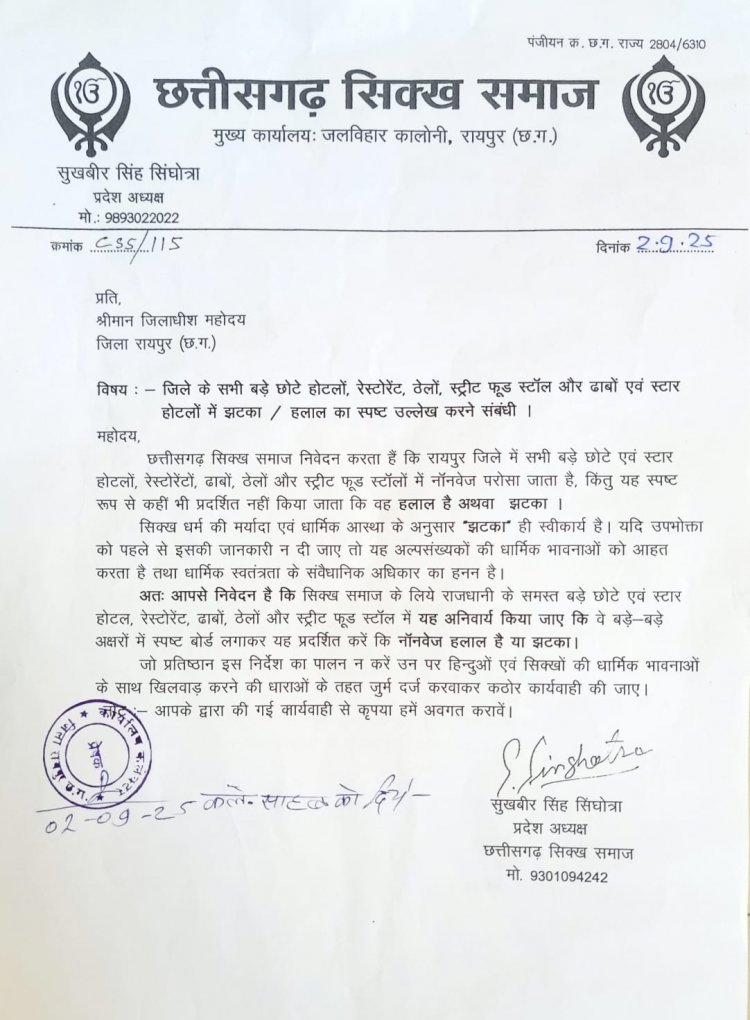 रायपुर, छत्तीसगढ़: छत्तीसगढ़ सिक्ख समाज ने जिलाधीश Dr. गौरव कुमार सिंह से मांग की है कि जिले के सभी होटलों, रेस्टोरेंटों, ढाबों, ठेलों और स्ट्रीट फूड स्टॉलों में नॉनवेज परोसने वाले प्रतिष्ठानों में यह अनिवार्य किया जाए कि वे स्पष्ट रूप से प्रदर्शित करें कि उनका नॉनवेज "हलाल" है या "झटका"।
