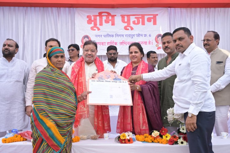 रायपुर दक्षिण विधायक सुनील सोनी और महापौर श्रीमती मीनल चौबे ने प्रधानमंत्री आवास योजना अंतर्गत मोर जमीन मोर मकान योजना घटक अंतर्गत 5 पात्र हितग्राहियों को मकान निर्माण प्रारंभ करने भवन अनुज्ञा स्वीकृति पत्र प्रदत्त किया ।