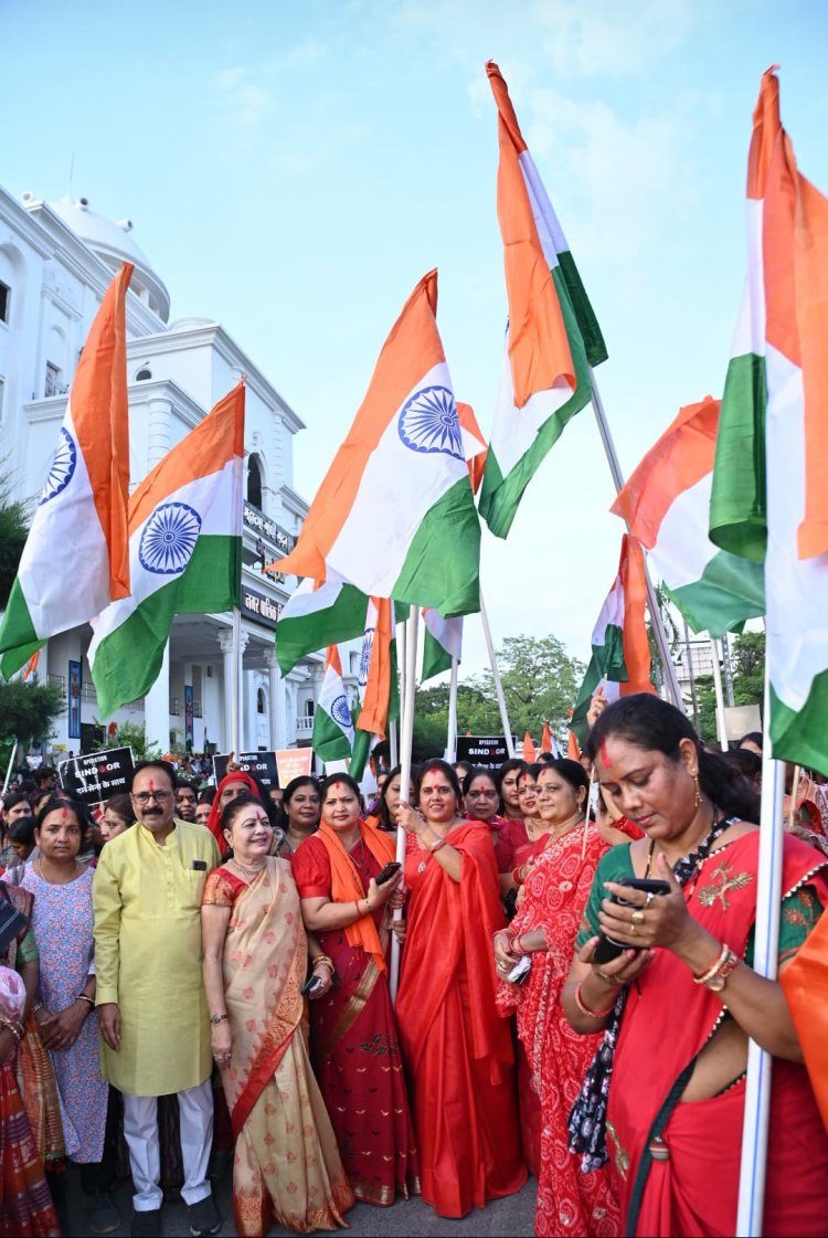 रायपुर - आज राजधानी शहर रायपुर की महिलाओं ने देशवासियों के गौरव एवं राष्ट्रभक्ति की अलख जगाने का प्रतीक बने भारतीय सेना के ऑपरेशन सिंदूर की शानदार सफलता पर राजधानी शहर में नगर पालिक निगम रायपुर के मुख्यालय भवन महात्मा गांधी सदन से गांधी मैदान एवं सिटी कोतवाली महावीर चौक होकर मालवीय रोड होते हुए जय स्तंभ चौक तक लगभग डेढ हजार से अधिक की संख्या में महिलाओं ने राष्ट्र भक्ति का परिचय देते हुए राजधानी शहर की प्रथम नागरिक नगर पालिक निगम रायपुर की महापौर श्रीमती मीनल चौबे संयुक्त नगर निगम की महिला पार्षदों एवं अधिकारियों कर्मचारियों की उपस्थिति में आपरेशन सिंदूर की शानदार सफलता के लिए भारत गणराज्य के यशस्वी प्रधानमंत्री नरेन्द्र मोदी एवं भारतीय सेना को धन्यवाद दिया।