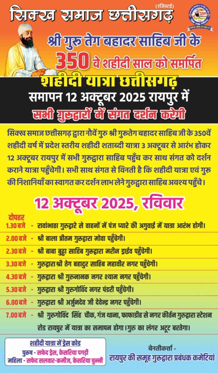 श्री गुरु तेग बहादुर साहिब जी की 350 वीं शहीदी शताब्दी यात्रा का आज रविवार को स्टेशन रोड गुरुद्वारा रायपुर में समापन होगा 3 अक्टूबर को राजधानी रायपुर से शुरू हुई 10 दिवसीय प्रदेश कीर्तन यात्रा पूरे प्रदेश के प्रमुख जिलों के सभी गुरुद्वारों सहित संगत को दर्शन देकर आज 12 अक्टूबर को राजधानी रायपुर पहुंची |