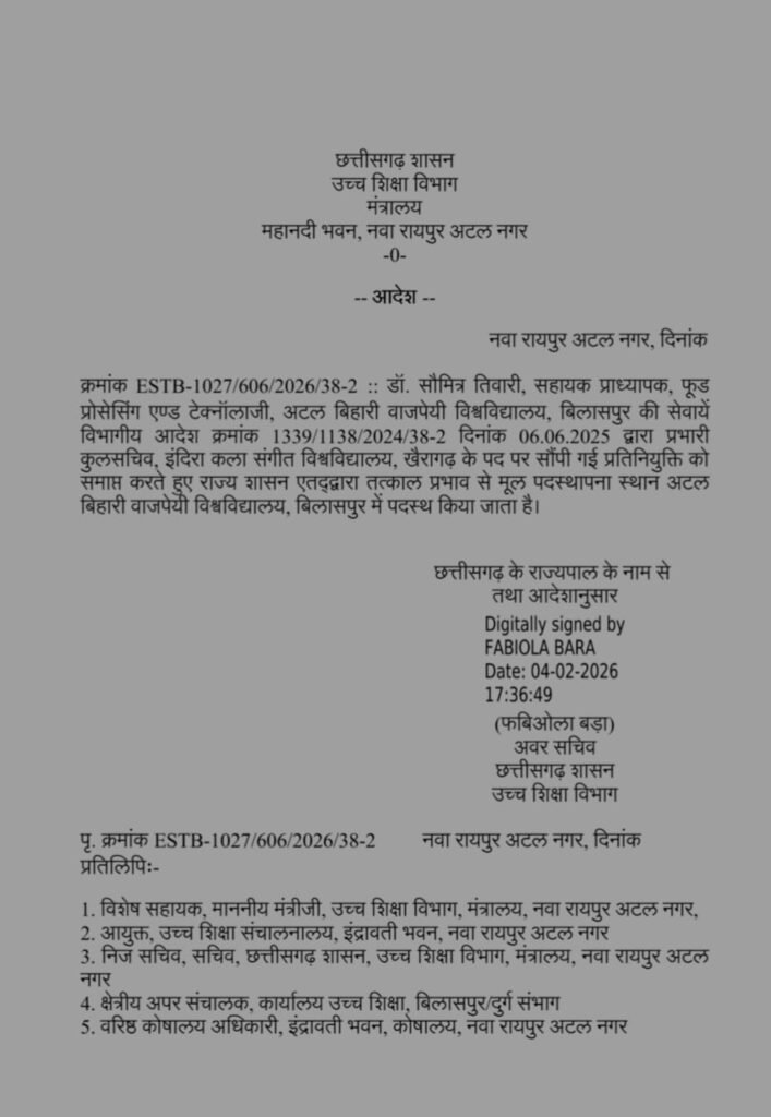 Khairagarh University Transfer: राजकुमारी इंदिरा सिंह कला एवं संगीत विश्वविद्यालय खैरागढ़ के कुलसचिव सौमित्र तिवारी का तबादला कर दिया गया है। उन्हें अब अटल बिहारी वाजपेयी विश्वविद्यालय बिलासपुर में नई पदस्थापना दी गई है। उनके स्थान पर खैरागढ़ विश्वविद्यालय को जल्द ही नया कुलसचिव मिलेगा।